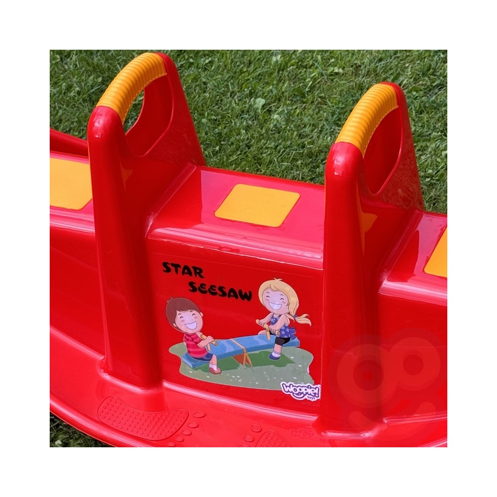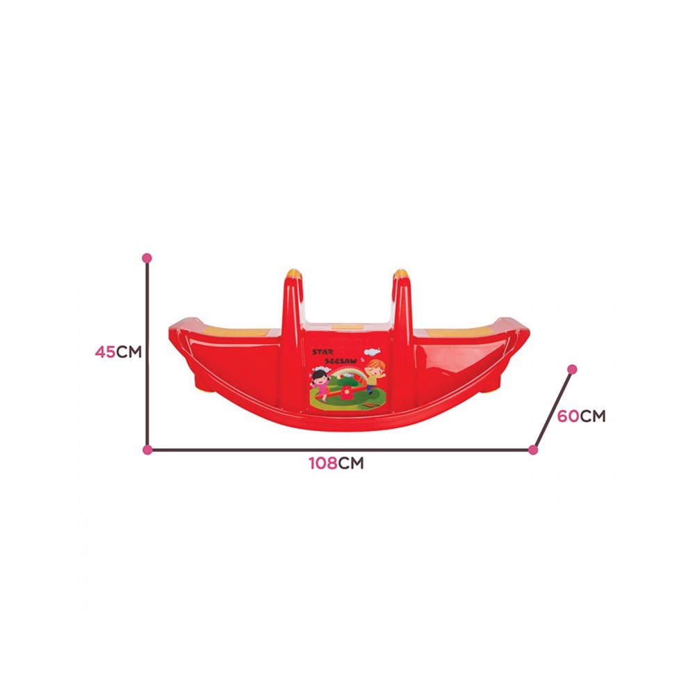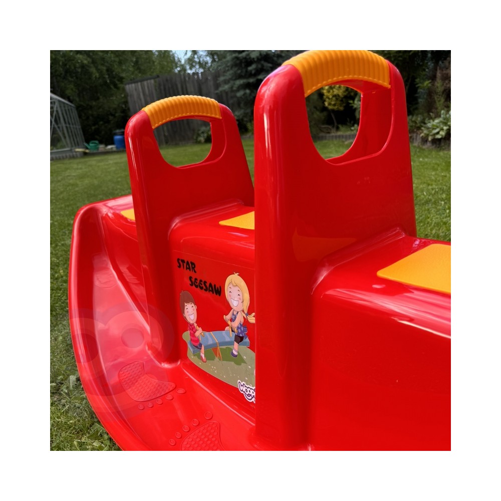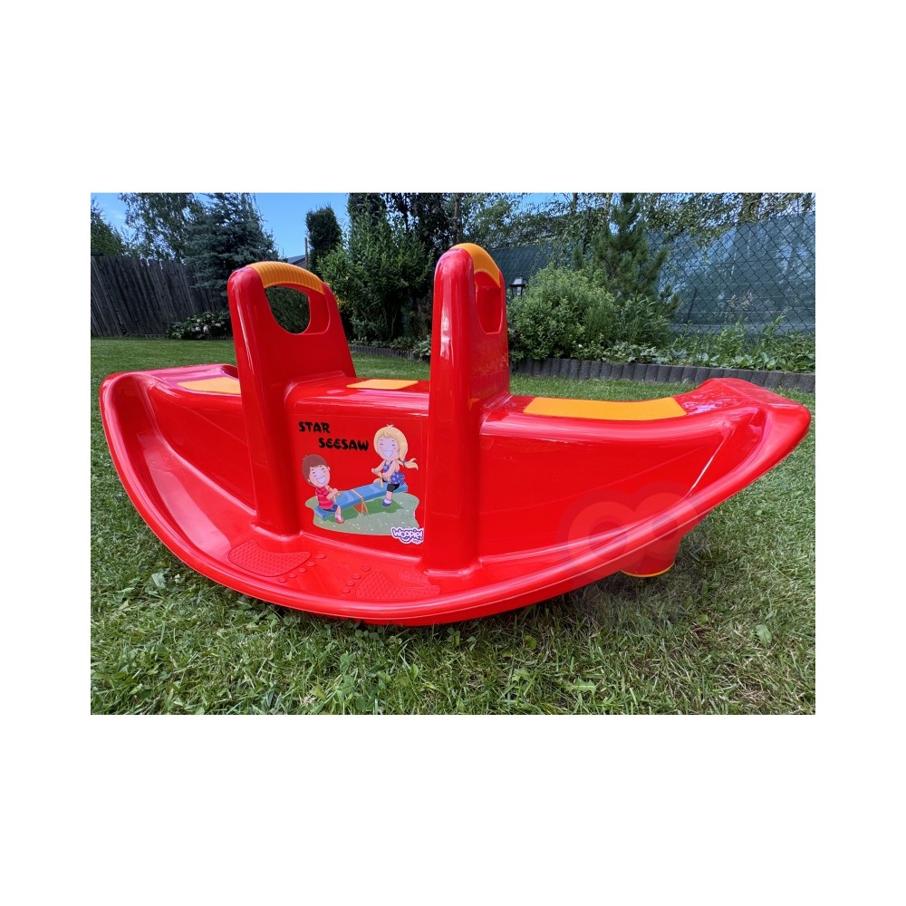 Plastikowa dwusobowa huśtawka - bujaczek. Wykonana z mocnego plastiku w kolorze czerwonym.