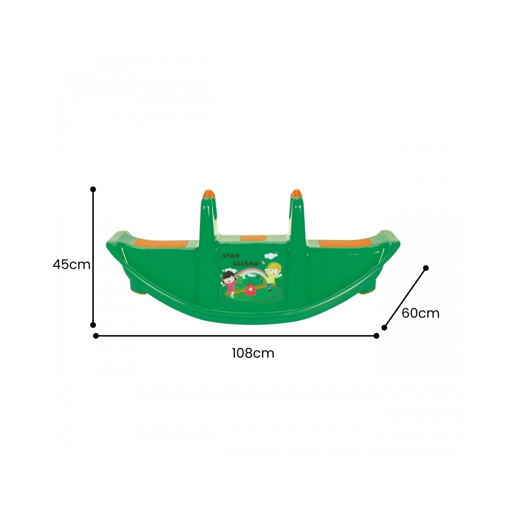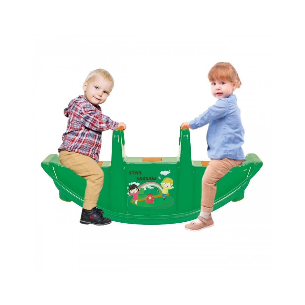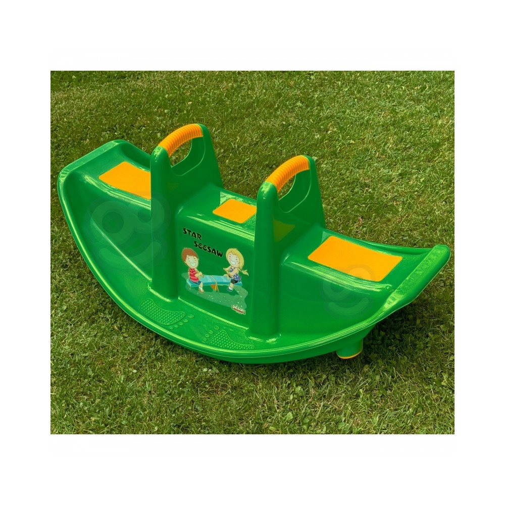 Plastikowa dwusobowa huśtawka - bujaczek. Wykonana z mocnego plastiku w kolorze zielonym.
