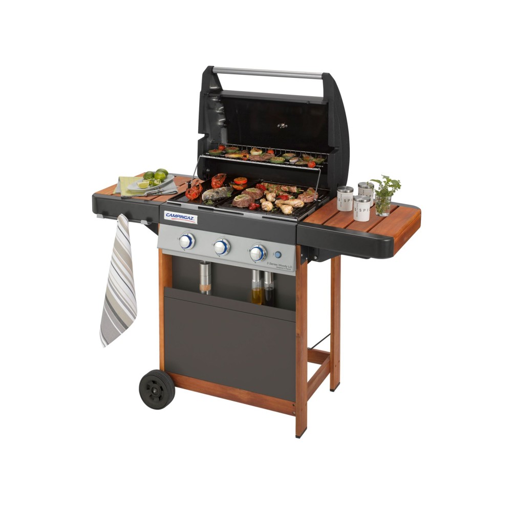 Grill gazowy Campingaz Woody L Seria 3 to stylowy grill z elementami drewna akacjowego przeznaczony dla ok 12 osób. Emaliowany ruszt oraz 3 wydajne palniki tubowe ze stali nierdzewnej zapewniają dużą wydajność. Niezależnie regulowane palniki dają precyzyjną i płynną możliwość sterowania temperaturą na powierzchni rusztu, a osłony palników odpowiadają za bardzo równomierny rozkład temperatur na powierzchni grilla. Pełna dwustronna płyta stalowa na pewno przyda się do grillowania warzyw i owoców, serów lub drobnych produktów, a także do wszystkiego co normalnie można grillować na ruszcie.